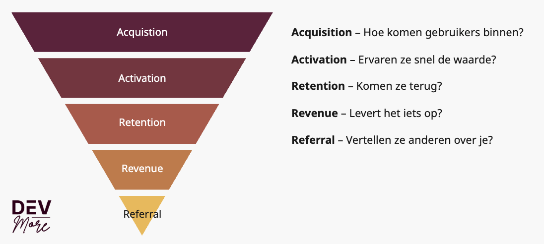 Als je wil groeien, is het verleidelijk om meteen naar nieuwe kanalen, campagnes of features te grijpen. Maar de vraag is: waar zit op dit moment écht momentum in je product? Dat ontdek je niet op gevoel, maar met structuur. Een handig framework hiervoor is AAARR – ook wel bekend als Pirate Metrics 🏴☠️.