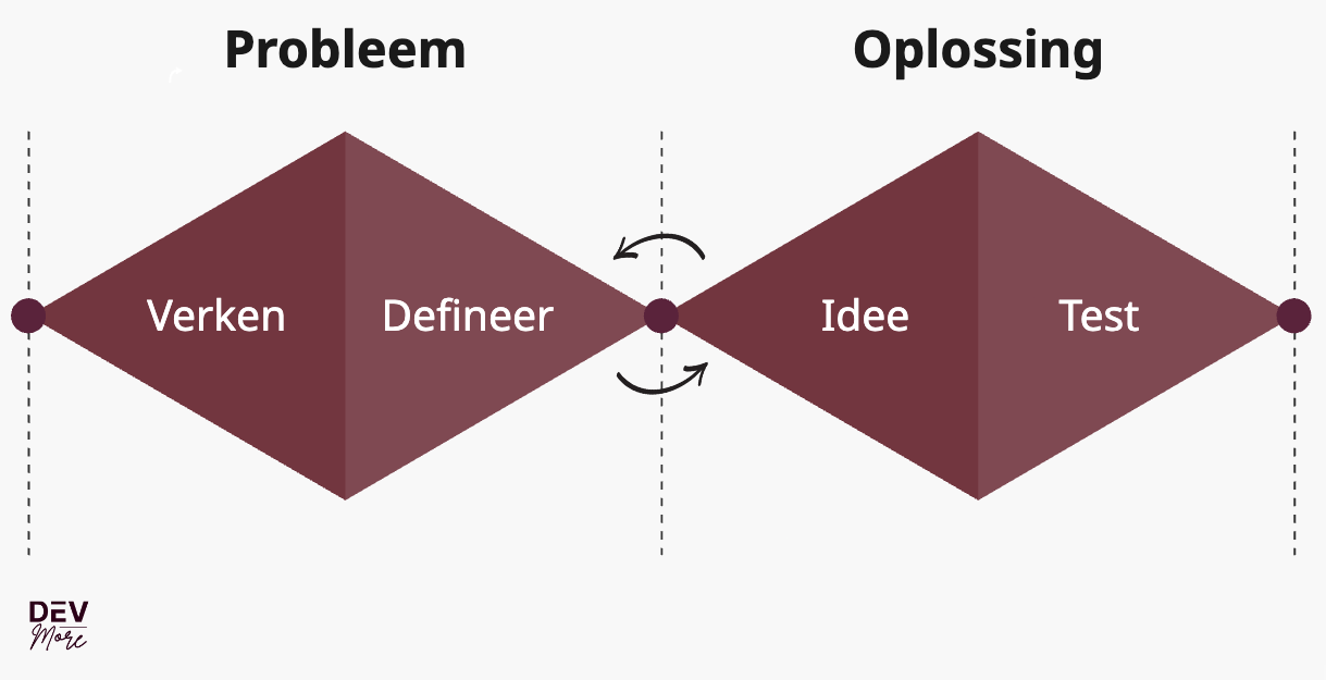 De twee diamanten vertegenwoordigen de beweging van divergeren (breed verkennen) naar convergeren (focussen en kiezen) in twee opeenvolgende fasen: